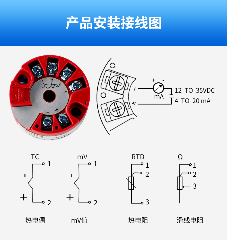 溫度變送器采用熱電偶、熱電阻作為測溫元件,從測溫元件輸出信號送到變送器模塊,經過穩壓濾波、運算放大、非線性校正、V/I轉換、恒流及反向保護等電路處理后,轉換成與溫度成線性關系的4~20mA電流信號0-5V/0-10V電壓信號,RS485數字信號輸出。