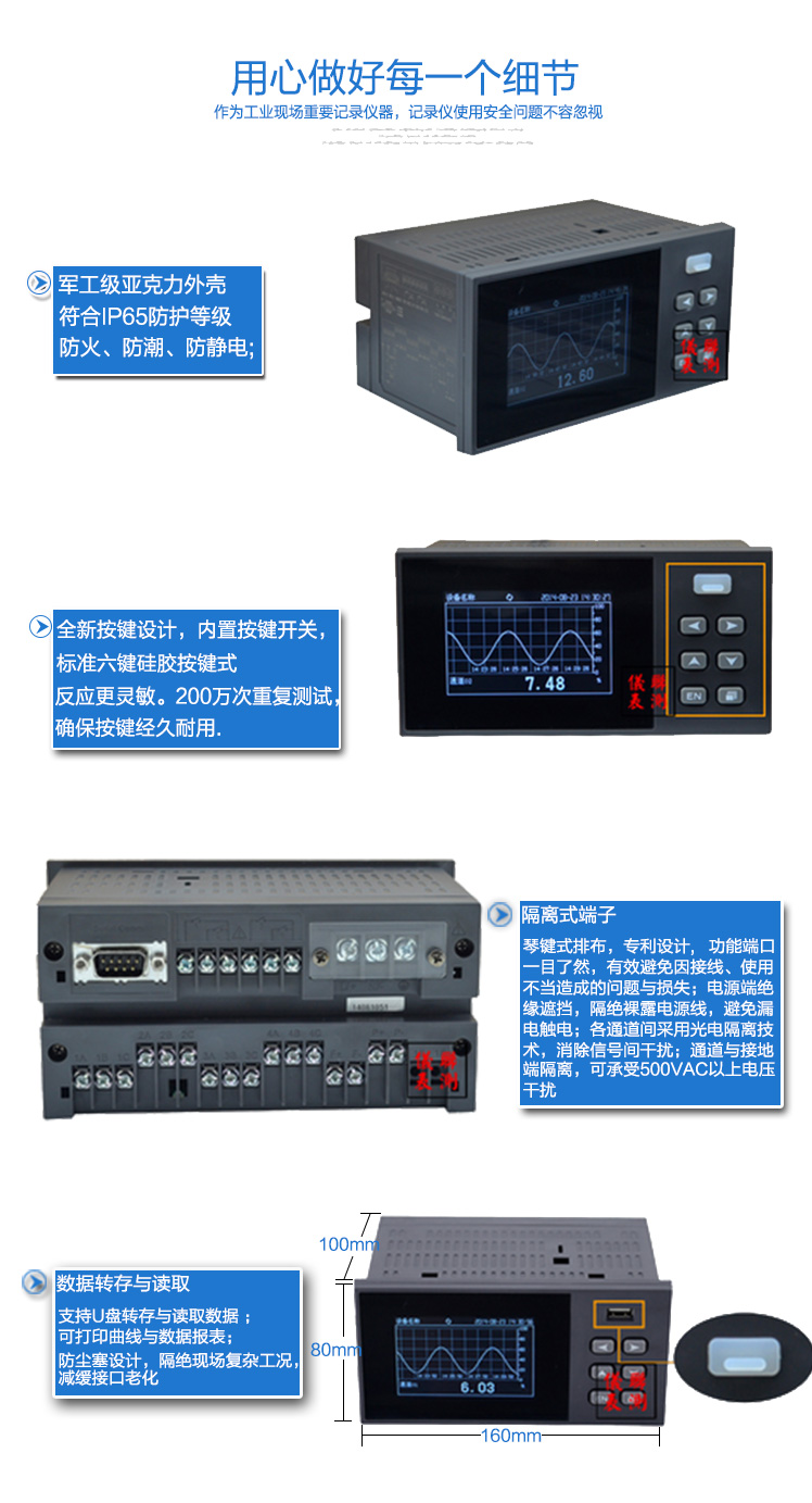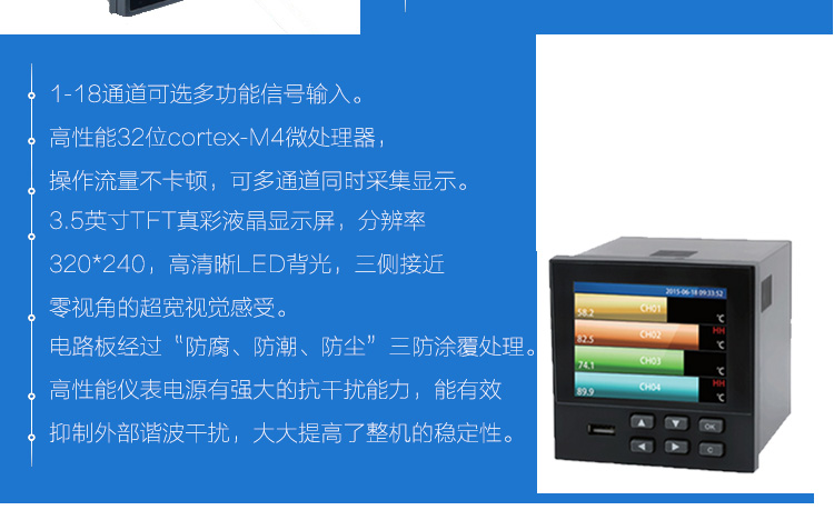 無紙記錄儀是將采集的數據/運算數據以時間為基軸記錄在儀器內部的存儲系統中,無消耗任何常用的記錄設施,如:紙張、筆墨。記錄在儀器內部的存儲數據,通過運算、模擬后顯示在液晶屏。常用顯示用液晶屏比較廣泛。在液晶屏屏幕上,可以顯示數字顯示、棒圖顯示、曲線顯示、報警列表等。無紙記錄儀采集的數據,常用的有:溫度、壓力、流量、液位、電壓、電流、濕度、頻率、振動、轉速等。
